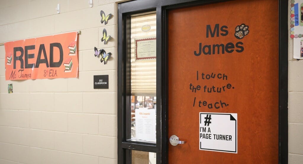 Despite that closeness, Dial says middle school can be a tough and divisive time for students. “They’re trying to figure out who they are. They’re starting to really appreciate the problems that they have, and they’re trying to deal with those. And some of them have to grow up faster than they would like.” That makes it doubly important, he says, to have teachers who can help put their experiences in context—like Claudine James. “She will go and find resources and content that’s relevant to the students,” Dial says. “So she gets a lot of buy-in from the students, because they can connect their situation to the situation they’re learning about in that particular unit. They feel like the content is important to them, because they can identify in one way or another with people in the novels that she chooses or in the historical content that she’s chosen to teach.”