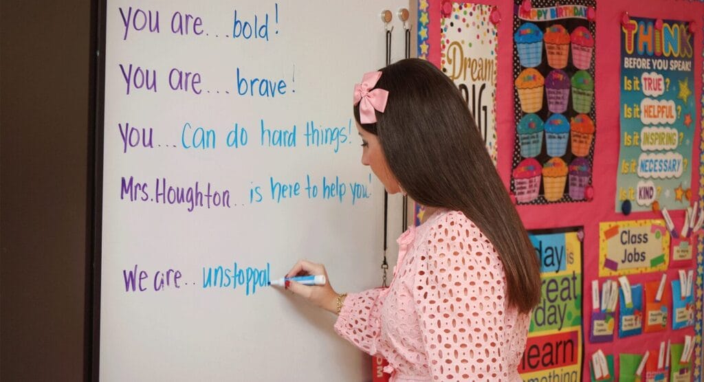 MRS. HOUGHTON: Years from now, they’re not going to remember the specifics of the math that I teach them, and the reading that I teach them, and the writing that I teach them, but they are going to remember how I make them feel. And my hope is that I’m sending them off into the world feeling good about themselves. And my ultimate goal is to help them to see themselves the way I see them, as capable, brave, strong humans who can go off and leave a mark in the world.