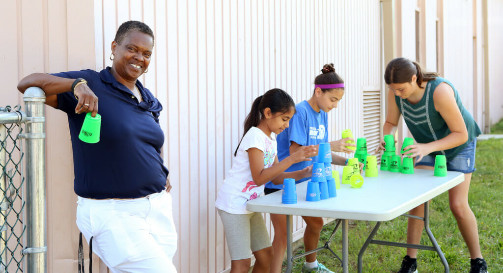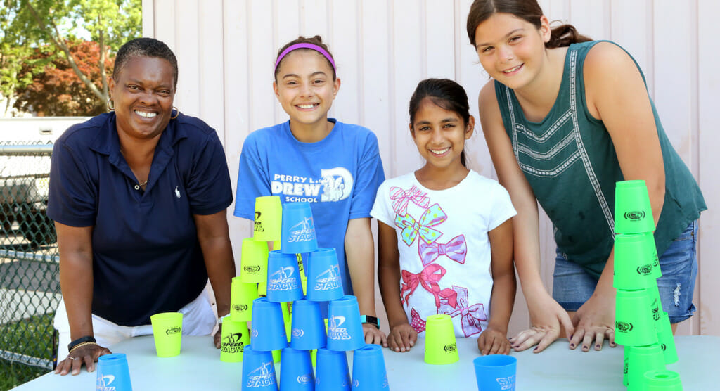 Around town, however, Ms. Chase is best known as the queen of the cups — and with good reason. Over the past two decades she’s mentored scores of students through her sport stacking club, first at Walter C. Black Elementary, and for the past 10 years at Perry L. Drew. The club was an idea borne out of curiosity after Ms. Chase stumbled upon stacking at a convention in Philadelphia in the late ‘90s, and as the sport has grown to include players around the globe, her club has taken on a life of its own, to the point where stacking is now part of her P.E. curriculum on campus.
