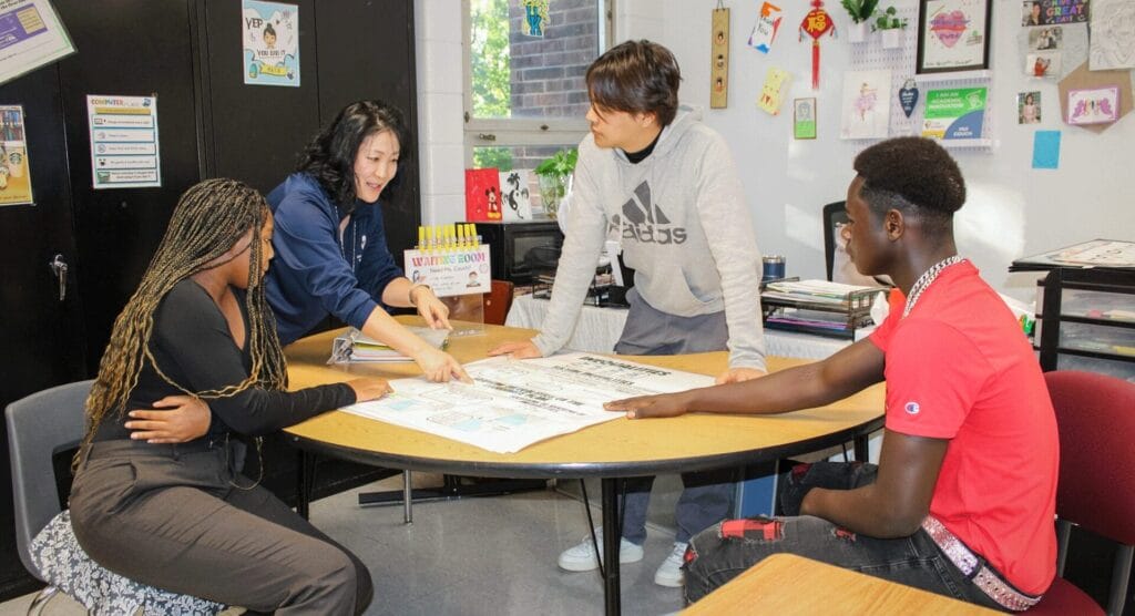 HANNAH BOWYER-RIVETTE: At Newcomer Academy, the goal is to provide a welcoming and respectful environment to meet the needs of sixth through twelfth-grade English language learners. In Hui’s classroom, she teaches beginning English language learners who speak nine different home languages. With the Modern Classrooms Project method, Hui has the flexibility to meet students where they are so they feel supported and challenged, no matter their pace or language level.