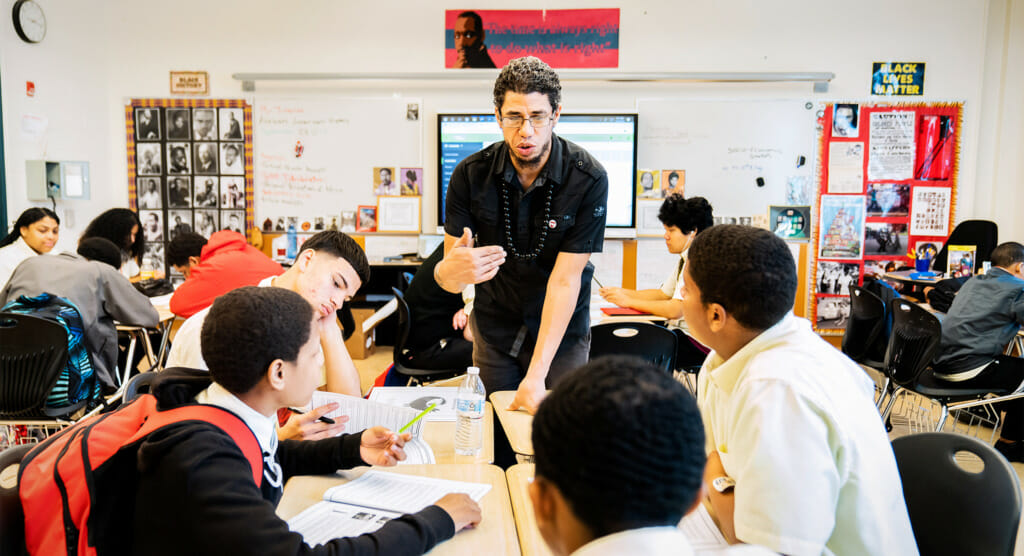 The fluidity is strong; you see moments where Jimenez becomes student; times that he’s a spectator; times that another individual in the class will referee the conversation or debate. You watch the class have their will bent toward not who has power but who has the most valid perspective or words in the moment. And suddenly the posters of Malcolm and others feel less like decorations and more like totems, informing and imbuing the surroundings with generations of thought and lessons that everyone in the room accesses. Amidst the din of voices is Donovan Bennefield, a junior who quickly helps me make sense of Mr. Jimenez’s room: “We’re learning with him and he’s learning with us—that doesn’t happen in other classrooms.”