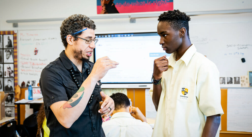 Standing in the front of his African American History class, Ismael Jimenez dissects the world on the whiteboard more like a forensic scientist than a classroom instructor. With his red marker, he circles a couple of key words—”culture,” “society,” “individualism”—and as he works his way through a five sentence paragraph, the students sit in small pods of desks where they jot down notes and shift about. All around the classroom, the walls chatter with history and society. The words and images of everyone from W.E.B. DuBois to Ella Baker, Malcolm X to Frederick Douglass, and many others are emblazoned on the wall in poster form, and around them are words and passages from generations of Black history. In addition to those lionized figures, though, are also the grim horrors and reminders about the context that made so many of those Black heroes necessary: There are images and texts about slavery, with the contradictory rhetoric used to justify it at the time and the methods and conditions around it. There are words and passages from the Civil Rights Era; black and white photos that capture that mixture of resiliency and humiliation, triumph and violence. So Jimenez’s classroom at Kensington Creative & Performing Arts High School feels busy and vibrant, brimming with the sort of intellectual angst that you’d imagine finding more in a college lecture hall, not in this North Philadelphia high school. The effect is strong and instantaneous, and there’s Ismael Jimenez, who looks both professorial and relaxed as he moves through the class.