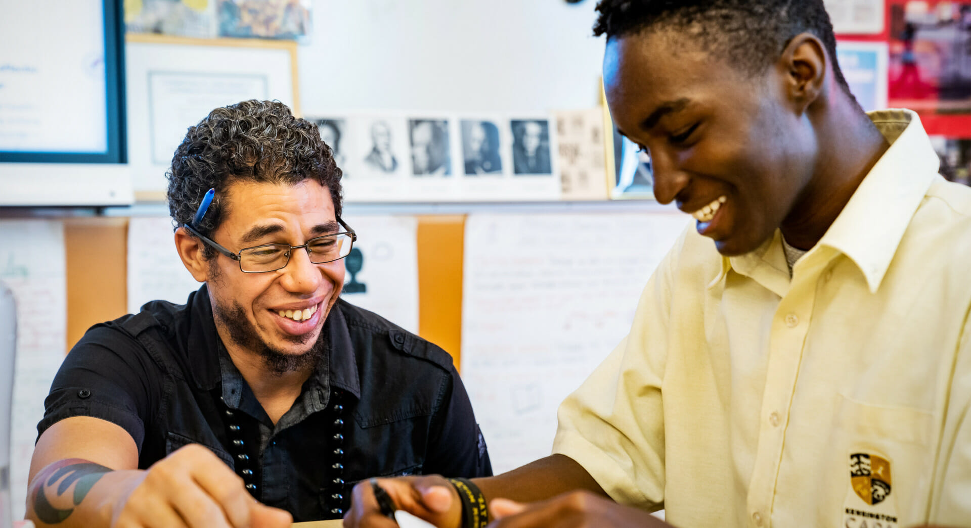 The fluidity is strong; you see moments where Jimenez becomes student; times that he’s a spectator; times that another individual in the class will referee the conversation or debate. You watch the class have their will bent toward not who has power but who has the most valid perspective or words in the moment. And suddenly the posters of Malcolm and others feel less like decorations and more like totems, informing and imbuing the surroundings with generations of thought and lessons that everyone in the room accesses. Amidst the din of voices is Donovan Bennefield, a junior who quickly helps me make sense of Mr. Jimenez’s room: “We’re learning with him and he’s learning with us—that doesn’t happen in other classrooms.”