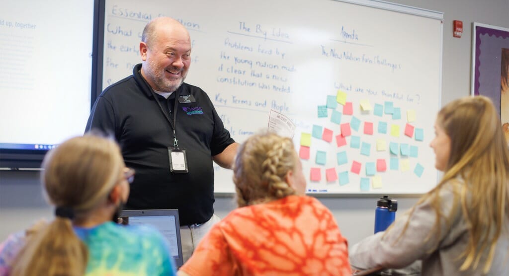 This got a lot harder last year, when Oasis Middle School teachers took on the Herculean task of teaching remotely and in person, simultaneously. This was something they’d never done—no one had—and it was extremely challenging, especially at first. One of the hardest aspects of the situation was that Ball had never even met some of the students he was teaching—a real blow to someone who thrives on personal connection. He describes himself as “a guy without a playbook.”