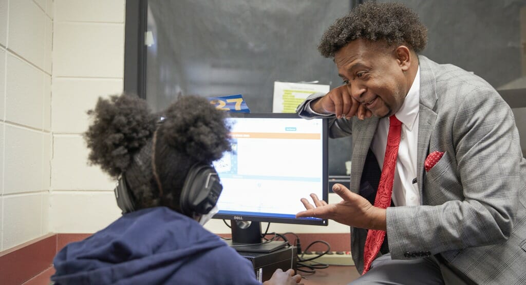 Johnson hopes that other Black men follow in his footsteps into becoming a teacher. While he is not the only Black male teacher at Huntington, Johnson was the only Black male teacher at his two prior schools—an unfortunately common phenomenon nationwide, as only 2% of all educators are Black men. As a Black man, Johnson understands why many of his Black students are frustrated or stressed by daily life issues. He says many of the students’ parents work low-paying jobs just like his father, which helps him understand their lives. That understanding gives him context for when students’ life stress shows up in their classroom behavior. “Even when students haven’t been acting the best, he still treats them with respect,” says Amir Howard, one of Johnson’s students.