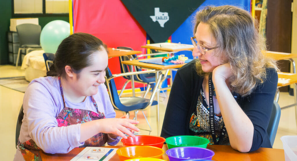 In Tanya’s classroom at Prosper High School, all of the students work together. They take their core classes together, they eat their meals together, and they learn to do things for themselves and for others. “We’re like a family,” Tanya says, “and everyone has chores they learn to do.”